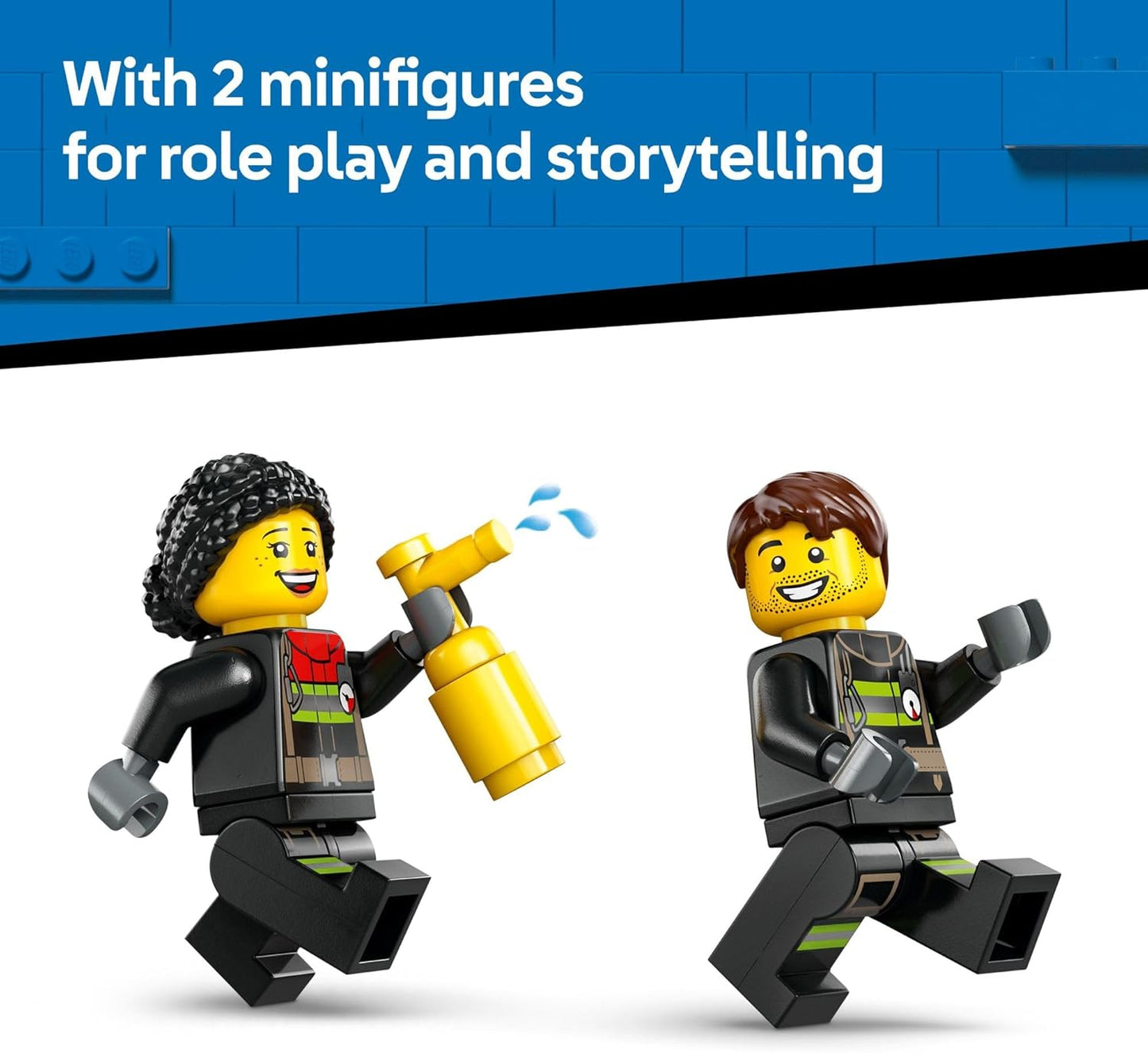 This fire truck set features 2 firefighter minifigures, plus 2 flicker flames, and a toy handheld extinguisher Truck comes with a 2-seater drivers cab and a raisable ladder 82 pieces Ages 4+